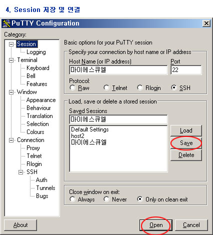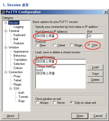우선 putty를 실행시키고, hostname 과 protocol을 선택한다.