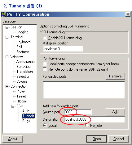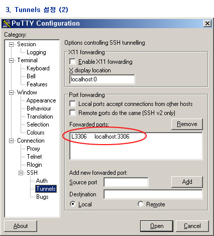Add 버튼을 누르면, port forward 에 위와 같이 L3306 localhost:3306 으로