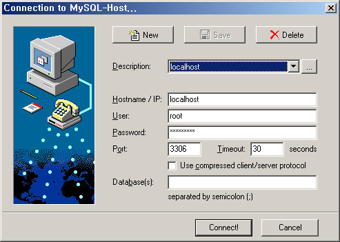 Mysql-Front 를 실행시키고, 위 그림과 같이 셋팅하여 접속한다.